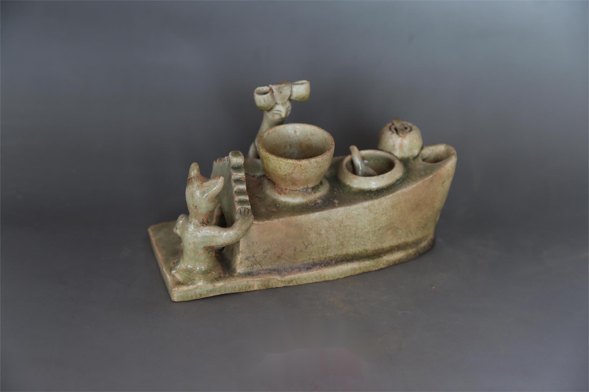 南朝洪州窑青瓷妇人炊事灶 高11厘米、长20厘米、宽10厘米,社会征集。二级文物。冥器。船形灶台上三个灶口,一个灶里有锅有勺,一个灶台上有缸形锅,另一个最边上的灶...