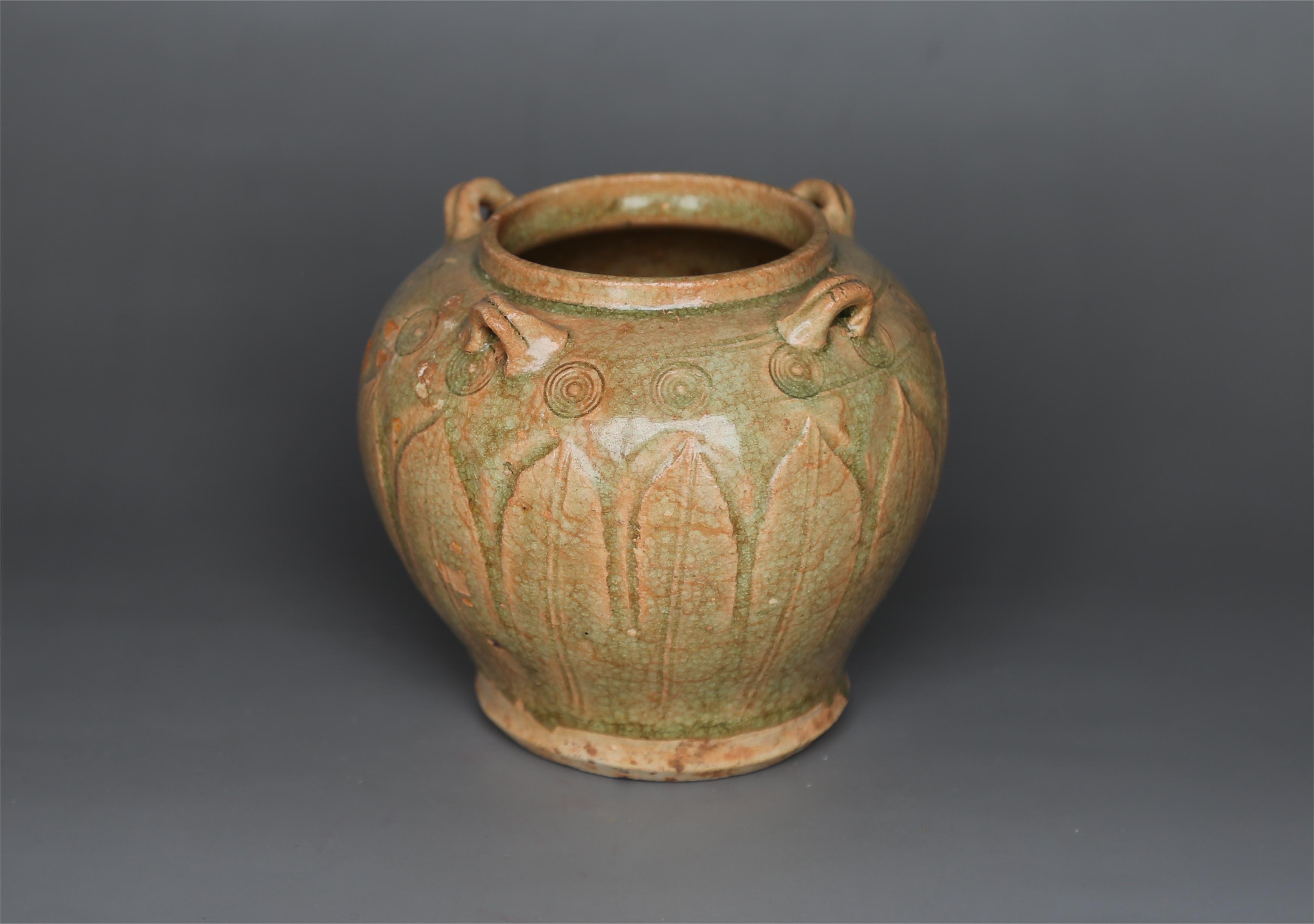 隋洪州窑青瓷圈点莲花纹四系罐 高11.5厘米、口径7.8厘米、底径8.5厘米。社会征集。二级文物。鼓腹,肩下均匀围塑有莲花纹饰,每个花瓣尖上有一个四圈环绕的同心圆纹饰。此...