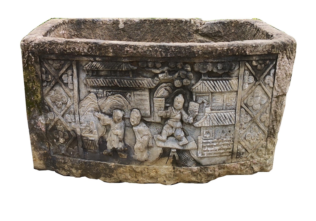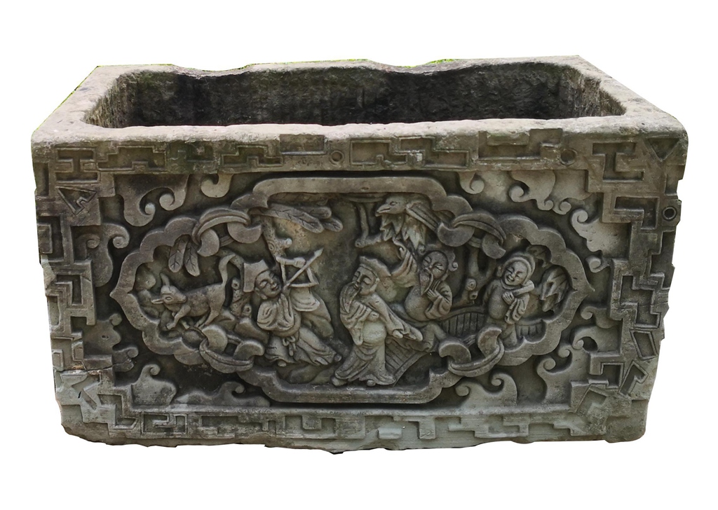 人物纹石盆 石盆造型方正,盆口折沿,左下略有缺损,中间开窗,中间开窗雕刻人物纹,雕刻生动传神,器形饱满大方。