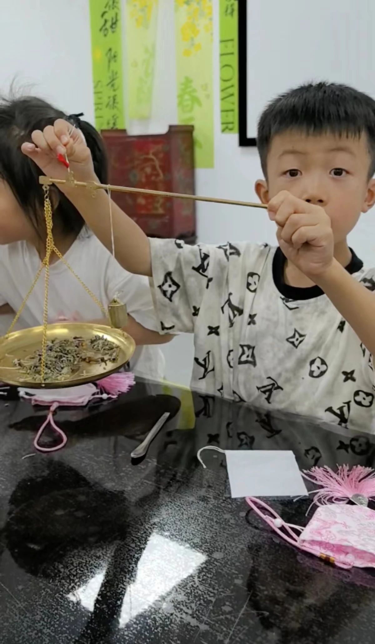 参观了酱卤博物馆后,亲手制作一款自己喜爱的香囊会是什么体验?按照工作人员给出的配方与步骤,同学们拉开了架势,先看一看这些香料都长什么样,用传统的铜秤称重,石菖蒲祛湿合胃,艾草驱虫驱蚊,薰衣草镇定安神……统统搞里头!药碾子、捣药罐都用上,“三明治”方法盛装碾碎的香料……大家忙的是不亦乐乎。