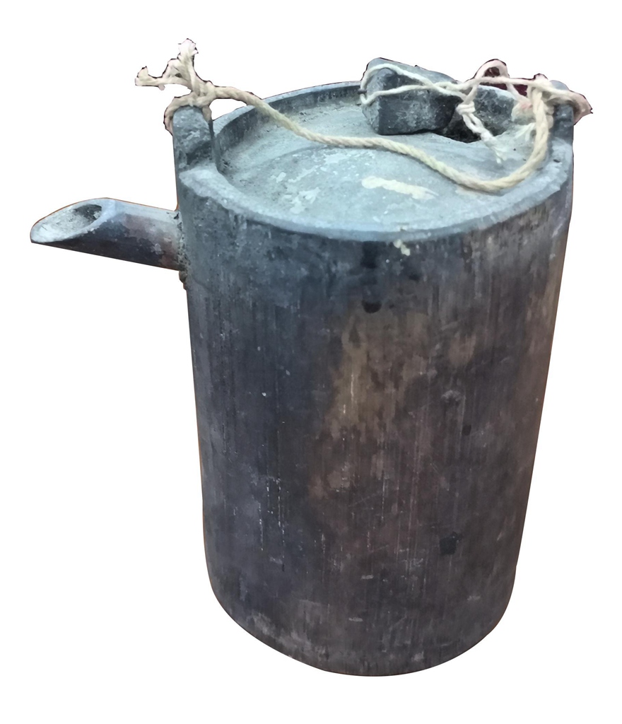 柱酒壶 带盖柱形竹酒壶,双耳可穿绳提篮,壶嘴细小,素面。