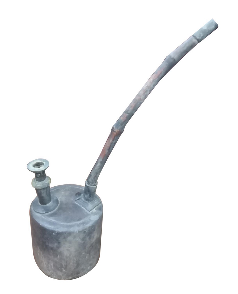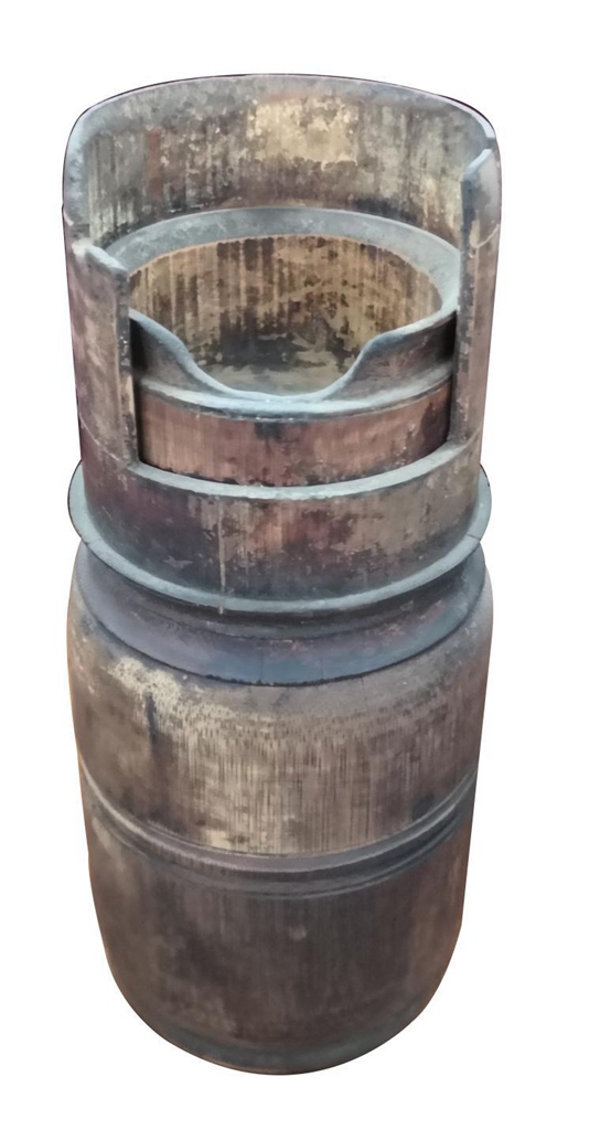 竹圆斗 圆斗由竹片绑制而成,两边铜拉手,圆口长颈,整体成瓶形。