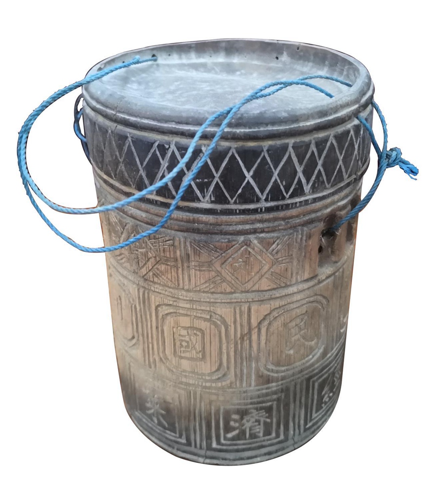 回字纹竹罐 竹罐带盖可穿绳提拉,盖檐刻格菱纹罐身刻回字纹。